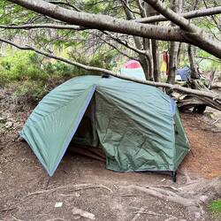 Ziehe mich an und geh mal aufs Klo. Über mir haben die Wolken aufgerissen, es nieselt noch leicht. Dann packe ich meine Isomatte und den Schlafsack ein. Alles aus dem Zelt nehmen. Es ist jetzt um 0600, ganz hell, Das Aussenzelt hat nur noch wenige Tropfen drauf, schüttle die ab. Das Aussenzelt ist mit dem Innenzelt/Boden durch eine Klickverbindung gesichert. Den Boden habe ich hier mir Häringen gesichert (dabei aber zwei verbogen). Beschwere das Aussenzelt mit einem Rucksack. Ich habe Wetterglück - kein Regen und wenig Windböen. Innenzelt Häringe auf einer Seite weg, einfalten, beschweren. Andere Seite dito. Dann das Aussenzelt alten und drauflegen.