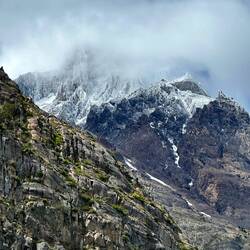 Es geht ins Gebirge, das Wetter wird schlecht, da hängen überall Wolken. Im See sind die ersten schwimmenden Eisbrocken zu sehen. Das Seeufer besteht meist aus schwarzem Sand oder Stein, Geröll.