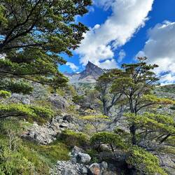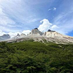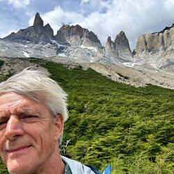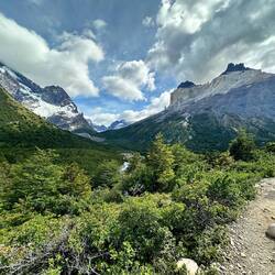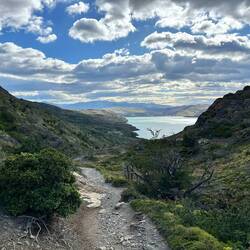 Es regnet immer leicht und windet stark - bei der einen steilen Steigung habe ich so Rückenwind, dass es mich echt fast hinaufbläst. Der Weg ist echt schön. Zwar leicht auf und ab, aber gut zu gehen, etwas sandig, vor allem in steilen Partien! Überhole Viele mit Gepäck und ohne, einige kommen auch entgegen. Der Torres ist immer noch im Grauschleier, wo ich stehe, ist Sonne und ab und zu Kühlung durch leichten Regen. Zurück jogge ich des öfters und erschrecke manchmal Leute. Auch meine Kniekehlen machen wieder mit, bis auf einmal keine Probleme. 8 km mit rund 200 Meter Steigung in 1:52 Std.
