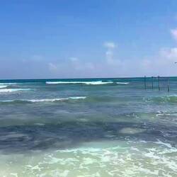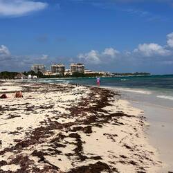 Vor Playa del Carmen befindet sich die Insel Cozumel, wo rege getaucht wird, Man sieht die Hochhäuser vom Strand hier meist gut. Kreuzfahrtschiffe fahren täglich vorbei.Læs mere
