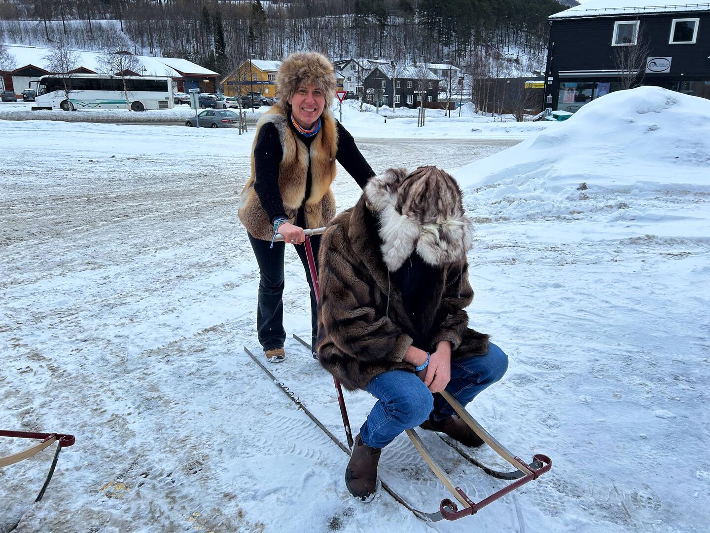 1. Bild - Hund auf dem Schlitten ( welchen wir von älteren netten Damen ausgeliehen haben) -
