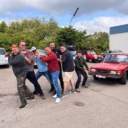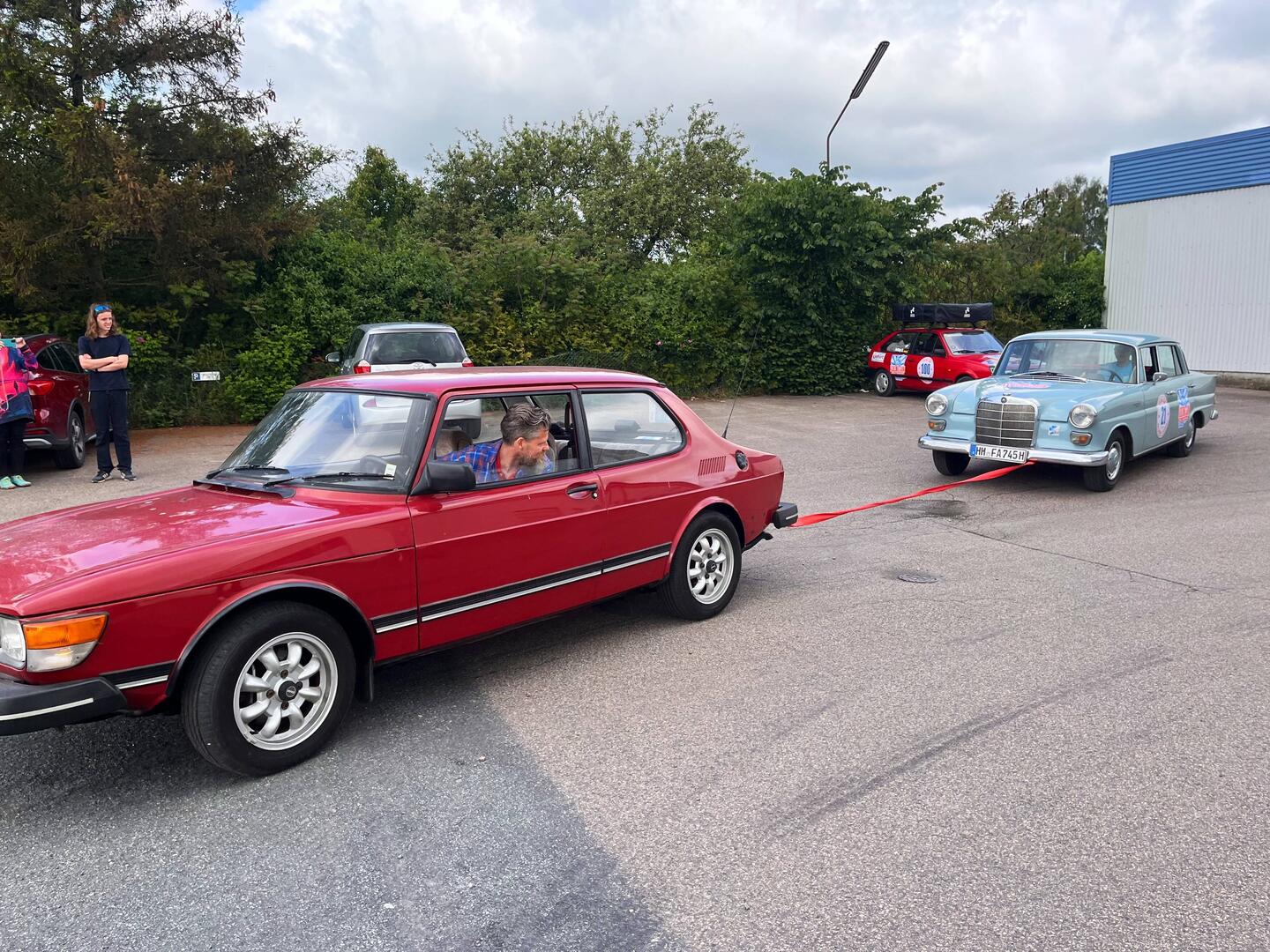 Ein richtig cooler Schwede hat uns mit seinem Saab 99 ein paar Meter gezogen. Die Mission-Punkte sind uns sicher. Und der nette Saab-Schwede hat sich seinen Vodka verdient.