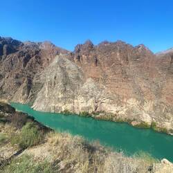 Zuerst durch die ChychanSchlucht vorbei an schönen Bergen, die im Frühjahr sicher grün gewesen waren… hinunter zum Stausee Toktokul. Dieser staut den großenBaca lagi