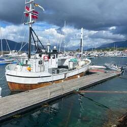 Wanderung abends 19:30 Uhr zum Torghatten. Wäsche waschen am Hafen von Brønnøysund. Als die Wäsche fertig gewesen ist, haben wir sie nicht mehr rausbekommen.