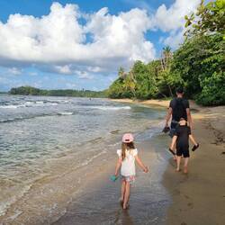 Gestern wurden wir mit einem kleinen Bus an die Ostküste nach Puerto Viejo de Talamanca gefahren. Wir legten einen kleinen Zwischenstopp ein, bei dem wir direkt einen kleinen Kolibri zu sehen bekamen. Wir kauften uns Wasser und ein paar gesalzene, fritierte Bananenchips, die wohl typisch für Costa Rica sind. Auf dem Weg an die Küste passierten wir viele Bananenplantagen. Zu Mariks Glück hörte der Busfahrer sogar Championsleague! Angekommen in unserer Unterkunft staunten wir nicht schlecht. Wir bekamen eine riesige Lodge direkt am Pool mit 4 Schlafzimmern und 3 Bädern zugewiesen. Die Anlage ist sehr klein und besteht aus höchstens 10 Lodges, wovon kaum eine belegt ist. Die Kinder, geschafft von der langen Reise sprangen direkt in den Pool und genossen die Abkühlung. Das Klima ist hier schon sehr tropisch bei 34 °C und sehr hoher Luftfeuchtigkeit. Nach einer ausgiebigen Pause beschlossen wir noch den Strand zu erkunden. Zu Fuß etwa 10 Gehminuten entfernt liegen die tollsten Strände, an denen der Urwald direkt an den weißen Sandstrand heran reicht. Bereits der Weg zum Strand war ein Erlebnis. Wir entdeckten erneut einen kleinen Kolibri in einer Hibiskusblüte, unzählige blaue Krabben, mehrere Agutis und eine große Spinne. Es gibt hier so viel zu entdecken! Am traumhaften Strand sind überraschenderweise kaum Menschen. Wir spazieren bis zur Punta Uva am Strand entlang und an der Straße zurück.