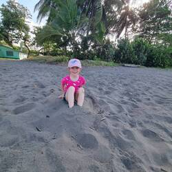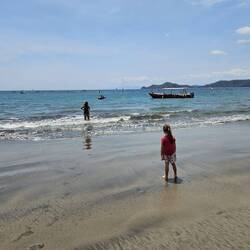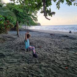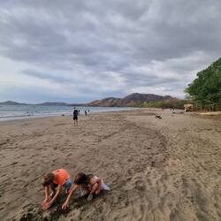 Leo weckt mich früh. Sie möchte unbedingt wieder zu den Kühen gehen. Die Männer sind nicht zum aufstehen zu überreden und so brechen nur wir Mädels zur Ranch auf. Eigentlich sind es nicht die Kühe zu denen es Leo zieht, sondern die Pferde, stelle ich schnell fest. Wir beobachten wie diese gefüttert, gewaschen und gestattelt werden und ein lieber Vaquero setzt Leonora kurzerhand auf eines der Pferde und führt sie herum. Es heißt Monita, was so viel bedeutet wie kleines Äffchen. Nach dem Frühstück brechen wir auf zur Pazifikküste nach Playa Hermosa. Wir klappern ein paar Tauchschulen ab, bis Tobi die für sich passende gefunden hat. Wir haben ein sehr schönes, eher nobles Hotel direkt am Strand. Der Pool ist umgeben von Bäumen, in denen Leguane und Brüllaffen umher laufen. Wir baden eine Weile im Meer. Der Sand ist ganz fein und es geht seicht ins Wasser. Besonders Marik liebt die Wellen und das knapp 30 Grad warme Wasser. Zum Sonnenuntergang laufen wir am Strand umher. Überall gibt es bunte Krabben und kleine Einsiedlerkrebse. Wir nehmen sie auf die Hand und freuen uns, wie sie schnell wieder herunter krabbeln. Das kitzelt! Wir finden eine coole Bar und essen dort lecker Abendbrot und lassen den Abend ausklingen. Es fängt an aus Kannen zu gießen und wir laufen später im dunklen, bei Regen am Strand zurück. Da es aber immer noch sehr warm ist, stören die warmen Tropfen kaum. Die nächsten Tagen werden wir eher entspannt verbringen und den Pool und das Meer genießen.Read more