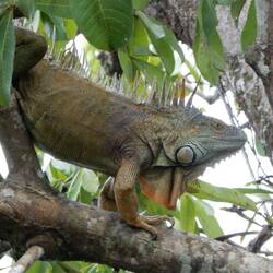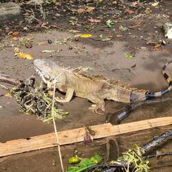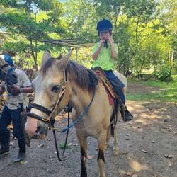 Gegen Mittag brachen wir in brütender Hitze zu unserem Nachmittagsausflug auf. Mit dem normalen Linienbus wollten wir nach Cahuita fahren. Das die Costa Ricaner es nicht so genau mit der Pünktlichkeit nehmen, bemerkten wir schnell als wir 20 Minuten in der sengenden Hitze auf den Bus ohne Klimaanlage warteten. Im Flugzeug hatte eine ausgewanderte Deutsche die Ranch von "Brigitte" empfohlen. Brigitte kam vor 40 Jahren aus der Schweiz nach Cahuita und eröffnete den damals ersten touristischen Pferdehof an der Ostküste. Wir hatten über WhatsApp Kontakt und sie bot an, uns persönlich am Bus Stop in Cahuita abzuholen. Wir erkannten einander gleich und wir fuhren ein kurzes Stück Taxi zu ihrer kleinen Ranch, wo bereits Santana, Bonita, Sol und Neya gesattelt auf uns warteten. Tobi, der bis dato noch nie auf einem Pferd gesessen hatte, bekam eine 1 minütige Einweisung und stieg tapfer auf. Man muss wohl keinem erzählen wie euphorisch er diesem Ausflug entgegen blickte 😉. Wir starteten mit Juan, unserem fast nur spanisch sprechenden Guide an den Strand. Es folgte ein 1,5 stündiger Ritt entlang des Playa Negra (schwarzer Sand) nach Norden. Wir ritten sogar durch den "Dschungel" und sahen einen Tukan und grüne Papageien am Wegesrand. Die Kinder und ich genossen diese einzigartige Erfahrung in vollen Zügen, während Tobi mit einem schmerzenden Po zu kämpfen hatte. Er hielt sich aber tapfer und stellte gegen Ende fest, dass Galopp doch die bequemste aller Gangarten ist 😅. Wieder bei Brigitte angekommen zeigte diese uns noch 2 Faultiere, die auf Ihrer Ranch lebten und einen sehr großen Leguan, der zufällig gerade vom Baum gefallen war (diesen aber bereits in Windeseile wieder hochkletterte).