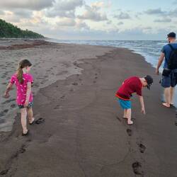Wieder von den eindrucksvollen Rufen der Brüllaffen geweckt, wurden wir gegen 6 Uhr von unserem Shuttle abgeholt. In der Nacht hat es hier das erste Mal seit unserer Ankunft kräftig geregnet. Da wir hier eigentlich in der Regenzeit reisen, ist es sehr untypisch dass es momentan so heiß und trocken ist, erzählt uns der Busfahrer. Das "Low Season" ist, haben wir bereits bemerkt, denn wir sind auf unseren Aktivitäten bisher immer allein unterwegs gewesen. Heute sollte es nach Tortugero gehen. Einem Nationalpark in dem man sich fast ausschließlich mit dem Boot fortbewegen kann. Wir fuhren vorbei an riesigen Bananenplantagen und konnten beobachten wie diese geerntet und aufbereitet werden. Auch hier hatten wir den Zubringer Bus + Boot ganz für uns allein. Wir entdeckten an einem Zwischenstopp einen Brüllaffen und eine knallgelbe Schlange. Danach stiegen wir in unser Boot, welches uns nach 90 minütiger Fahrt zur Mawamba Lodge, mitten im Tortugero Nationalpark brachte. Die Mawamba Lodge ist ein ausgezeichnetes, etwas größeres Hotel mit vielen kleinen Bungalows mitten im Regenwald. Es gibt einen großen Pool und leckeres Karibisches Essen. Als wir gerade im Pool baden, kommt ein fast 2 m großer Leguan zum Wasserfall des Pool um zu trinken. Tobi schaut nicht schlecht, als er durch den Pool taucht und beim auftauchen dem Leguan direkt ins Gesicht blickt... Marik probiert frisches Kokosnusswasser aus der Kokosnuss und ist begeistert. Am Nachmittag werden wir mit dem Boot in den Ort Tortugero gefahren. Dort schländern wir entspannt durch die Souvenirläden, entdecken einen Tukan und entdecken sogar ein Fußballfeld, auf dem gerade der 1. FC Tortugero gegen den FC Cocal ein hitziges Match austrägt. Wir holen uns ein Eis und verweilen eine ganze Zeit. Rückzu laufen wir etwa 20 Minuten am Strand, an dem theoretisch aktuell die große Leatherbackschildkröte (bis zu 2,50 m groß) zur Eiablage zu sichten ist, zurück zu unserer Unterkunft. Nach einem leckeren Abendessen endet auch dieser aufregende Tag und wir schlafen alle schnell ein.Read more