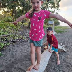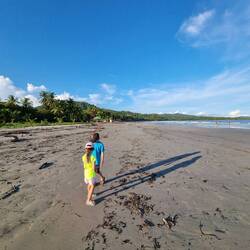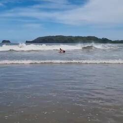Heute morgen werden wir vom Prasseln des Regens geweckt. Eigentlich wollten wir heute eine Delfintour mit dem Boot unternehmen, doch der Regen lässt das Ganze sprichwörtlich ins Wasser fallen. Also fahren wir stattdessen nach dem Frühstück zum nahe gelegenen Playa Carillo. An einem Ende des Strandes mündet ein kleiner Fluss, in dem auch das amerikanische Krokodil (bis zu 6 m Groß), heimisch ist. Mit einem Bodyboard im Gepäck sind wir schon bald am wunderschönen, Palmen umsäumten Strand. Dieser fällt flach ab und man kann sehr lange im Wasser stehen. Die Wellen haben eine Höhe von ca 1-3 Meter und eignen sich hervorragend zum Bodyboarden. Also heißt es: Ab in die Wellen. Vor allem Marik ist nicht zu stoppen und stürzt sich immer wieder wieder in die Fluten. Selbst Leo traut sich und macht erste Surferfahrung. So wechseln wir uns regelmäßig ab und genießen den fast menschenleeren Strand und die tollen Wellen bis wir alle aufgeschubberte Bäuche haben und die Kraft uns verlässt. Wir ruhen uns noch eine Weile aus und fahren dann zurück nach Samara und gönnen uns ein Eis. Einen Teil des Nachmittags verbringen wir im Pool und uns kommen mal wieder Brüllaffen besuchen. So nah wie hier konnten wir sie bisher noch nie bewundern und sie sind fast greifbar nah.