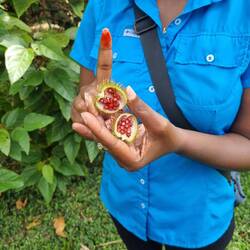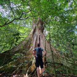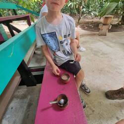 Nach einem entspannten Frühstück wollen wir heute herausfinden: Wie wird eigentlich Schokolade hergestellt? Keine 5 Minuten von der Lodge entfernt befindet sich der Ausgangspunkt für eine Schokoladentour. Unser Guide zeigt uns die Kakaofrucht und erklärt uns viele spannende Dinge rund um das Thema Schokolade. In einer Kakaofrucht befinden sich ca 20 Kakaobohnen. Ca. 80 braucht man, um eine Tafel Schokolade herzustellen. Wir laufen ein Stück durch den Wald und entdecken auf dem kurzen Stück eine Menge Frösche, einen großen Leguan, einen großen Tukan und ein Eichhörnchen, welches sich gerade über eine Kakaofrucht hermacht. Im Anschluss lernen wir etwas über den Prozess der Kakaoverarbeitung. Wir probieren die rohen Kakaobohnen, die mit einer schleimigen weißen, süß schmeckenden Substanz überzogen ist. Wir dürfen diese probieren. Sie schmeckt unheimlich bitter, aber man kann den Schokoladengeschmack erahnen. Die Kakaobohnen werden aus der Frucht geschält und 7 Tagen fermentiert. Im Anschluss werden diese getrocknet. Nun müssen die Schalen aufgebrochen werden. Denn nur die weichen Samen im Inneren werden für die Schokoladenherstellung benötigt. Im Anschluß müssen die zerkleinerten Bohnen noch in Schale und Samen separiert werden. Dies erfolgt mittels "Wind" und man Streut das Gemisch in eine Schale, während man kräftig mit einem Fächer wedelt und somit die leichten Bestandteile (Schale) davon wedelt. Nun wird das verbleibende Produkt gemahlen und es entsteht eine reine Kakaopaste. Sie riecht schon richtig nach Schokolade, schmeckt aber immer noch sehr bitter. Wir stellen eine 70% und eine 50% Schokolade her und fügen entsprechend Zucker hinzu. Jetzt ist der Geschmack schon ein ganz anderer! Es wird uns eine heiße Schokolade aufgebrüht, die wir mit verschiedenen Gewürzen verfeinern können. Vanille mit Zimt ist mein Favorit. Im Anschluss dürfen wir noch 2 weitere flüssige Sorten probieren. (Milchschokolade und dunkle Schokolade, mit Kakaonibs).