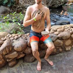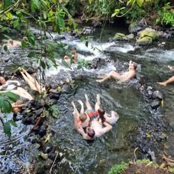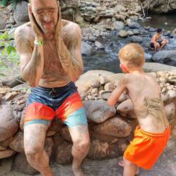 Wir reiben uns mit Heilschlamm ein und lassen ihn trocknen. Im Anschluss geht es in den kühlen Fluss, sich vom Dreck befreien und dann in die warmen Pools. Bei immer noch 33 ° C Lufttemperatur ist dies für den Kreislauf eine Herausforderung. Wir bleiben bis zur Dämmerung und fahren dann zurück zur Hacienda.