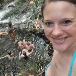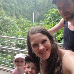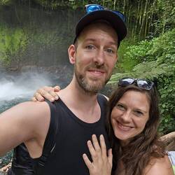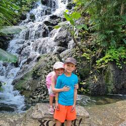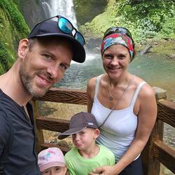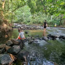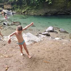 Am späten Nachmittag fahren wir zum berühmten Wasserfall von La Fortuna. Es geht dort 500 Stufen hinab zum Wasserfall. Das Wasser am Fuße des Wasserfalls ist relativ kühl aber angenehm und es schwimmen sogar Forellen um uns herum. Wir verweilen ein bisschen und treten dann den Rückweg, die 500 Stufen nach oben, an. Die Kinder halten tapfer durch. Eigentlich wollten wir die Kinder mit einem Eis belohnen, leider gab es keins und so wurden aus dem Eis Popcorn und Gummibärchen. Zum Abendessen fahren wir in den Ort in einen sehr leckeren "Organic Food" Laden und waren dann auch schnell müde und im Bett. Obwohl hier Regenzeit ist und jeden Tag das Regenrisiko mit 60-90% angegeben wird, regnet es so gut wie gar nicht. Regen haben wir hier erst 3 mal erlebt (davon 2x nachts).Read more