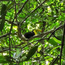 Unser Mittag fällt dementsprechend aus und wir fahren noch kurz in den Ort um ein paar Kleinigkeiten einzukaufen und Marik seinen lang ersehnten Fußball zu kaufen. Dort erwischt uns ein heftiger tropischer Regenguss, der aber reichlich wohltuend bei dieser drückenden Hitze ist. Da es regnet, fahren wir nicht direkt zur Lodge sondern kurven noch etwas mit unserem Auto durchs Hinterland. Wir sehen Wasserbüffel und einen wunderschönen Tukan mit grünem Schnabel. Leider ist dieser zu schnell für meine Kamera.