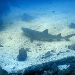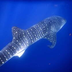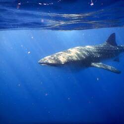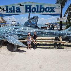 In der Zeit von Juni bis September sind die Meeresgiganten in den Gewässern um die Isla Mujeres /Holbox anzutreffen, da das Wasser in dieser Zeit hier am wärmsten ist und genügend Plankton als Nahrung zur Verfügung steht. Wir sind also guter Dinge eins dieser Tiere anzutreffen. Wir fahren mit einem kleinen Boot hinaus aufs offene Meer. Wir haben 2 Guides und sind 6 "Besucher". Wir fahren fast 2 Stunden mit voller Geschwindigkeit bis wir in keiner Richtung mehr Land entdecken können. Irgendwann wird das Boot langsamer und die Suche beginnt. Die Schwanzflosse des Walhaie ist sehr unscheinbar und die Wellen relativ hoch. Wir finden ihn eigentlich nur, weil 3 andere Boote es bereits vor uns getan haben. Wir ziehen unsere Flossen, Masken und Schnorchel an und machen uns absprungbereit. Gesprungen wird in 2er Teams + Guide. Das Boot stellt sich der Schwimmrichtung des Walhais in den Weg, man springt auf Kommando des Captains und schwimmt sofort was das Zeug hält dem Guide hinterher, der einen direkt ins Angesicht des Walhais bringt. Dieser schwimmt stetig mit einer Geschwindigkeit von 4-5 km/h und wir müssen ganz schön paddeln um ihn möglichst lang beobachten zu können. Dann geht es zurück zum Boot und das Spiel beginnt von vorn. Leo traut sich bei den hohen Wellen und der Hektik nicht ins Wasser, wir erhaschen aber von oben einen super Blick auf den Walhai als er direkt am Boot vorbei schwimmt. Wir anderen 3 können den Walhai unter Wasser bestaunen und was soll ich sagen. Es ist absolut surreal einem so großen Tier so nahe zu sein. Der Walhai ist ca. 7 m groß und ein wunderschönes Tier. Es ist atemberaubend und wahrscheinlich ein "once in a life time" Erlebnis. Nach etwa einer Stunde drehen wir und die anderen Boote ab und lassen das Tier in Ruhe seines Weges ziehen. Tobis Walhai- Fluch ist gebrochen und wir sind alle überglücklich über dieses fantastische Erlebnis.