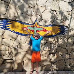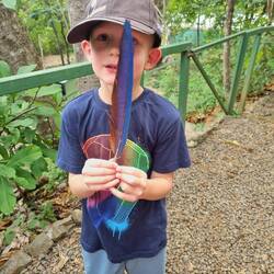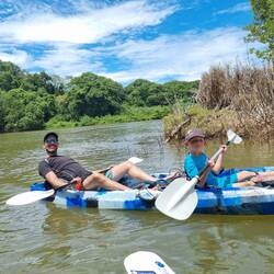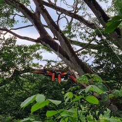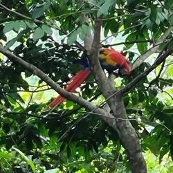 Wir entscheiden uns, an unserem zweiten Tag hier, für eine Kajaktour entlang des Rio Ora, vorbei an Mangroven und wunderbar grüner Natur bis zum Playa Comorales. Hier nisten häufig Schildkröten, denn der Sand ist etwas dunkler und kann dadurch die Eier auch Nachts besonders warm halten. Die Kinder finden viele tolle Muscheln und das Meer ist recht wild, aber wunderschön anzuschauen. Wir essen frische Ananas und Melone am Strand und fahren danach den Fluss wieder hinauf. Ich bin mit Leo in einem Kajak und paddle die komplette Strecke in der vollen Sonne allein, was einen ordentlichen Muskelkater und Sonnenbrand zur Folge hat. Zurück im Hotel kühlen wir uns im Pool ab und unternehmen am Nachmittag einen Ausflug zum Macaw (Ara) Recovery Center. Dieses hat nur 2 Stunden am Tag geöffnet und wir haben Glück, dass wir heute noch kommen dürfen. Das Ara Zentrum ist Heimat von anmutigen roten und grünen Aras, die hier gerettet worden sind und gezüchtet werden mit dem Ziel, diese in der El Arenal Gegend auszuwildern. Die Zahl der prächtigen Vögel ist in den letzten Jahrzenten immer mehr geschrumpft, unter anderem aufgrund von Chemikalien, die in den Ananasplantagen verwendet werden und auch der Zunahme natürlicher Feinde, wie den Tukanen. Die Aras lernen wie ihr natürliches Futter aussieht und wie sie dieses finden und verwerten. Die, die kurz vor der Auswilderung stehen, fliegen bereits frei durch die Landschaft und kommen nur zur Fütterungszeit zum Zentrum zurück. Wir sehen ca 10 Aras umher fliegen und beobachten die Fütterung in den Baumwipfeln (eine Plattform wird mittels Seilzug nach oben transportiert). Wir sind angehalten nicht mit den Aras zu sprechen und dürfen sie nicht berühren, damit diese sich nicht zu sehr an den Menschen gewöhnen. Es ist ein tolles Spektakel diese ungewöhnlichen Tiere relativ nah und doch frei beobachten zu können. Marik hat Glück und findet sogar eine blau/rote Arafeder.