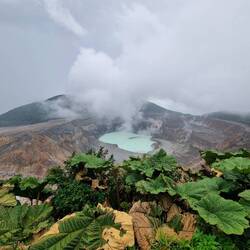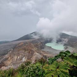 Als die Wolken endlich aufklaren, bewundern wir den Blick über den türkisen, dampfenden Kratersee und freuen uns alle über den beeindruckenden Anblick. 2017 ist der Poas das letzte Mal ausgebrochen und hat dabei einen Teil der Besucherplattform zerstört. Man sieht noch die Stellen, an dem die umher fliegenden Gesteinsbrocken vor 6 Jahren eingeschlagen sind.