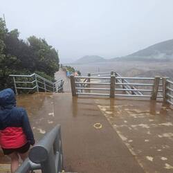 Nichts desto Trotz siegt unsere Sturheit und wir entscheiden uns wider der Bedingungen für einen Besuch am Krater. Mit Regenjacken ausgerüstet, laufen wir die 800 Meter bis zum Krater. Zwischendrin Joggen wir immer wieder kurz, denn für die 18 °C bei strömenden Regen sind wir einfach falsch angezogen und frieren uns den A**** ab. Am Ende sind wir nass bis auf die Unterhosen und werden mit Blick auf eine Nebelwand belohnt. Wir bleiben geduldig, stellen uns unter und warten bibbernd, bis sich die Wolken verziehen. Um uns blitzt und donnert es immer wieder. Am Aussichtspunkt selber ist eine Ampelskala für giftige Dämpfe. Während diese am Anfang immer blau blinkt (wenig giftige Gase), blinkt diese am Ende immer häufiger Orange (zunehmend giftige Gase), was sich bei mir in einem fiesen Reizhusten bemerkbar macht.