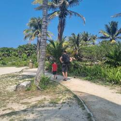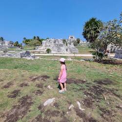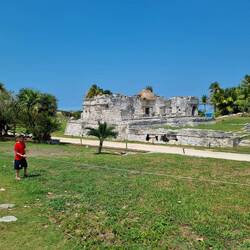 Im Anschluss beschlossen wir, noch nach Tulum zu den Maya Ruinen zu fahren. Als wir ankamen, waren wir schockiert. Seit unserem letzten Besuch hier vor 7 Jahren, ist der Ort touristisch völlig explodiert. Die Einheimischen sehen in einem wandelnde Banknoten und man bekommt auf Schritt und Tritt Dinge wie Souvenirs, Früchte, "exklusive Informationen", Fotos mit Affen, etc. angeboten. Wir lösen den Eintritt in die Ruinen und laufen bei 35 °C durch die Mayastadt. Wir sehen bestimmt 100 kleine und große Leguane, die sich in der erbarmungslos Hitze wohl fühlen und sich auf dem alten Gestein sonnen. Die Leguane sind unser Glück, denn sie motivieren unsere Kinder weiter zu laufen und sind, obwohl wir so viele davon schon gesehen haben, immer noch ein kleines Highlight für die Mäuse. Durchgeschwitzt entscheiden wir, noch kurz zum Strand zu laufen, dort etwas kaltes zu trinken und uns abzukühlen und dann zurück zum Auto zu laufen. Auch dort Ernüchterung: Kreditkarte nicht möglich und wir haben gerade noch Geld für ein einziges Wasser! Wir kühlen uns trotzdem kurz im Meer ab und laufen dann 30 Minuten bei Hitze zurück zum Auto. Alle fertig mit den Nerven, erleben einen kleinen Tiefpunkt und reagieren unsere schlechte Laune an uns gegenseitig ab. (Leo weint weil zu warm, Marik tun die Beine weh, Tobi dehydriert und genervt vom Gemecker der Kinder, ich versuche ruhig zu bleiben, bin aber auch erschöpft und genervt). Glücklicherweise besinnen wir uns alle schnell und raufen uns wieder zusammen. Uns ist bewusst, dass wir den Kindern viel zu viel zugemutet haben und was für uns schon anstrengend war, musste für die Kinder noch viel heftiger gewesen sein!