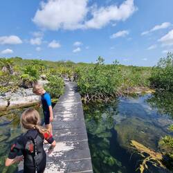 In den letzten 2 Tagen haben wir viel Zeit im Wasser verbracht. Tobi ging tauchen in den Zenoten "Nicté- Ha" (eher flach mit Stalagmiten und Stalagtiten) und "The Pit" (eher tief mit Nebelschicht und Mischwasser Salz/Süß und mystischen Lichteinfall von oben), während wir die Zeit am Pool verbrachten. Cenote bedeutet so viel wie "heiliges Wasser" und in der Maya Zeit glaubten die Menschen, dass diese Eingänge in eine Nebenwelt wären. Vor vielen Millionen Jahren war Yucatan ein Korallenriff, welches im Laufe der Zeit freigelegt wurde. In Folge dessen bildete sich ein unterirdisches Fluss- und Höhlensystem, welches heute als der größten Süßwasserspeicher der Welt bezeichnet wird. Aus diesem Grund gibt es auf Yucatan überall "Cenoten", Höhleneingänge mit Süßwasser gefüllt.