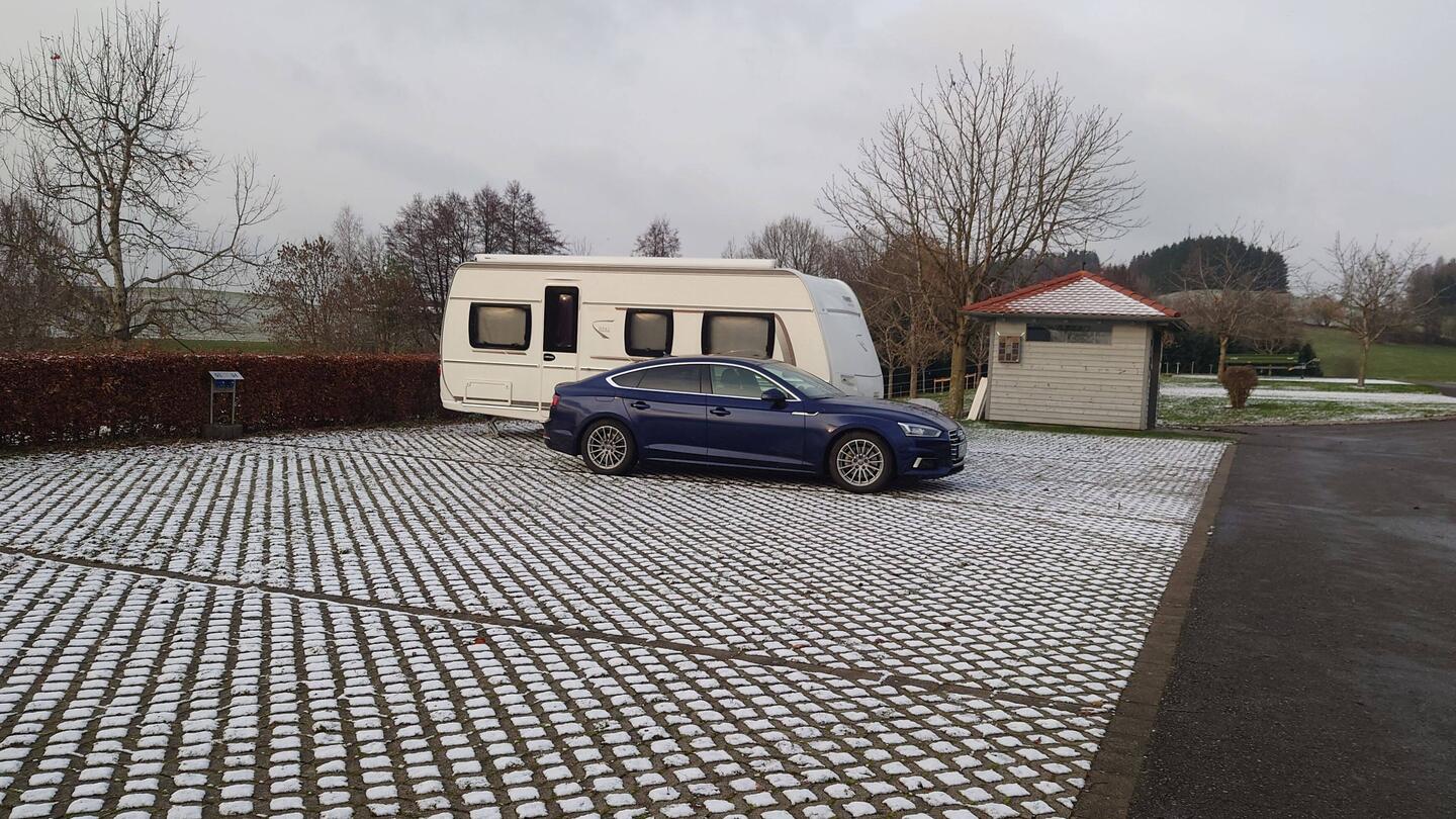 Ankunft am ersten Übernachtungsplatz Büchelwiesen, ein schöner Stellplatz in der Nähe von Amtzell mit Restaurant nebenan.