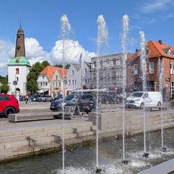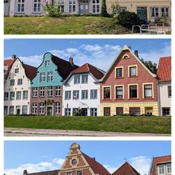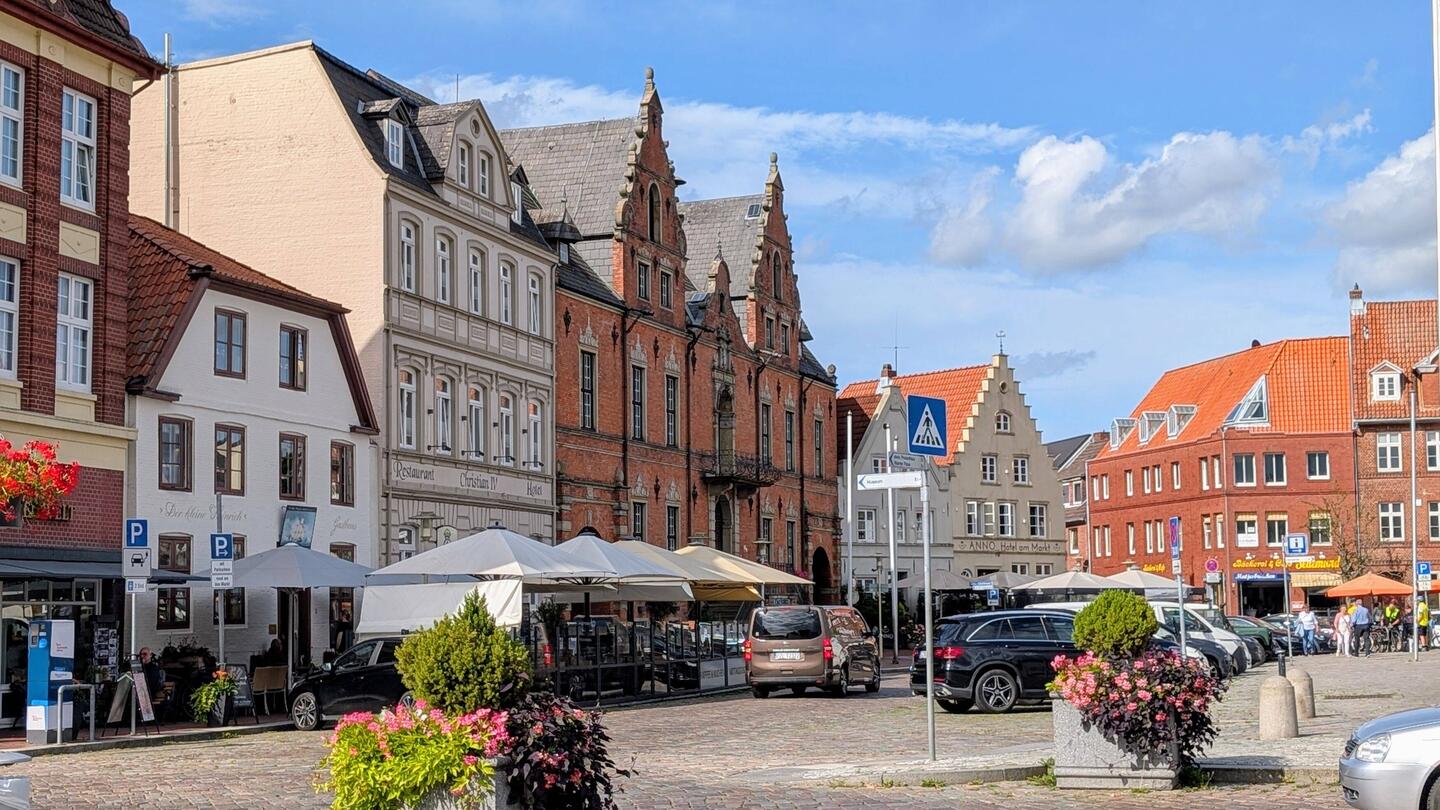 Wir gucken im Internet nach, wie die Wartezeit an der Fähre ist. Eine Stunde, da schauen wir uns lieber noch Glückstadt an. Ganz nett, viel Blumenschmuck, einige hübsche Häuser, geschlossene Restaurants und viel zu viel Betrieb. Wieder Menschenmassen und Autoschlangen.