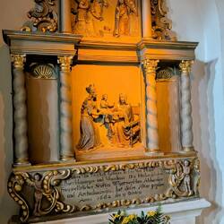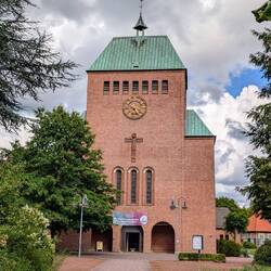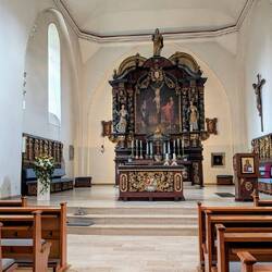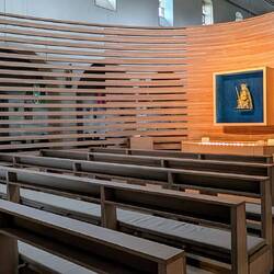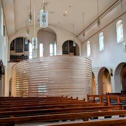 Während der gesamten Fahrt hat es heute immer mal wieder geregnet. Und so kommt auch bei unserem Spaziergang über das Stiftgelände ein kleiner Wolkenbruch, den wir in der interessanten Wallfahrtskirche Sankt Johannes Apostel aussitzen können. In den Innenraum der Kirche ragt die Marienkapelle hinein, nur durch eine transparente Lamellenwand getrennt.
