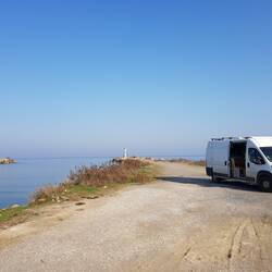 Mittlerweile ist schon wieder die Dunkelheit da und wir klappern ein paar Plätze am Strand ab, aber überall liegt so viel Müll und es ist nicht wirklich schön. Der nächste park4night Platz klingt laut Beschreibung auch nicht toll, aber als wir dann da sind, erscheint er uns doch ganz schön und mittlerweile ist es wirklich finster. Wir machen noch einen kurzen Hafen und Strand-Spaziergang und kuscheln uns dann in den Bus. Trotz des Platzes am Dorf und Hafen ist es wirklich ruhig und da schon am Eingang der Mole ein Schild mit Camping stand, scheinen sie hier die Womos zu akzeptieren.