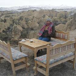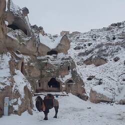 Wieder klingelt der Wecker um 7:30 und wieder können wir weiter schlafen, da sich keine Ballons zeigen :(. Kathi nutzt auch heute die Chance zu joggen, was etwas angenehmer ist als am Vortag. Wir beschliessen heute die Umgebung mit dem Auto etwas zu erkunden und fahren auf Erdwegen am Liebestal und später am weissen Tal entlang und landen schliesslich unterhalb von Uçhisar. Schon aus der Ferne haben wir diese wunderschöne Stadt bewundert und auch jetzt aus der Nähe werden wir nicht enttäuscht. Wir parken Louie in einer Kurve unterhalb des Felsenteils von Uçhisar. Hier ist ein beliebter Fotopunkt für all die Reisebusse, aber kaum einer der Touristen läuft hinauf in die Stadt. Uçhisar zeichnet sich vor allem dadurch aus, dass in seiner Mitte mehrere grosse Feentürme thronen, die teilweise bewohnt sind, teilweise die alten Höhlen der früheren Einwohner aufweisen. Ein kleiner Pfad schlängelt sich den Berg hinauf und wir haben die Chance in viele der Feentürme hinein zu klettern. Wunderschön! Als wir um eine Ecke biegen kann Kathi ihren Augen kaum trauen: Da steht ein Kamel! (Eigentlich ein Dromedar, aber das wurde uns erst später bewusst). Wir taufen sie Babsi und nähern uns vorsichtig. Sie schaut uns neugierig aus ihren Kulleraugen an. Was für ein seltsamer Anblick so ein Dromedar im Schnee zwischen Feentürmen. Plötzlich macht Babsi ein paar Schritte auf uns zu und wir bemerken, dass sie nicht angebunden ist. Wir sind beide nicht so erfahren im Umgang mit Dromedaren, sind uns aber einig, dass wir keinen der Hufen abbekommen wollen. Mit Sicherheitsabstand beobachten wir Babsi.