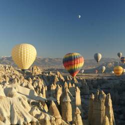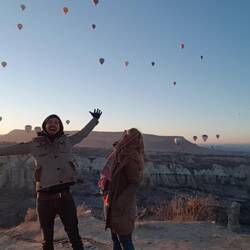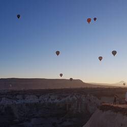 Kathi schiebt verschlafen den Rollo runter. "Ich sehe nichts. Ne, da sind keine Ballons." Maurice will sich selber vergewissern und schaut aus dem Dachfenster. "Und ob da Ballons sind!" Ein hektisches Anziehen beginnt, aber mit der richtigen Vorfreude ist man dann auch schnell wach. Der Anblick ist magisch. Überall steigen die Ballons aus den Tälern empor und verteilen sich am erst langsam hell werdenden Himmel. Auch neben uns, in der Nähe des Touri Aussichtspunktes, werden Ballons vorbereitet und erheben sich mitsamt voller Körbe in die Lüfte. So langsam kommt auch die Sonne heraus und liefert einen Bilderbuch Sonnenaufgang ab. Von einer Seite angestrahlt sehen die Ballons noch schöner aus und leuchten in allen Farben. Nach und nach tauchen die Ballons in verschiedenen Tälern ab und einige fliegen ganz nah bei uns vorbei. Unser Platz ist perfekt, auch was die Fotos angeht die entstehen. Zwischenzeitlich versucht Kathi die Ballons zu zählen, gibt aber bei 71 auf. An die 100 werden es sein, die dort in der Luft schweben. Die Bilder sprechen für sich. Auf jedenfall ein Spektakel das man sehen sollte! Wir sind so vertieft, dass wir gar nicht merken wie kalt es eigentlich ist. Wir sind dann aber doch froh nach 1,5 h in den warmen Bus zu kommen und einen Kaffee zu trinken. Die Müdigkeit macht sich auch bemerkbar. Müde aber glücklich versuchen wir wacher zu werden und gönnen uns ein gemütliches Frühstück.
