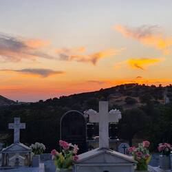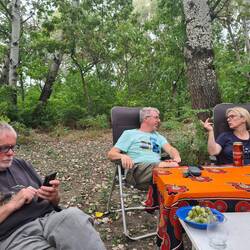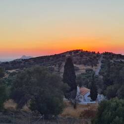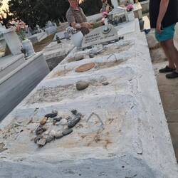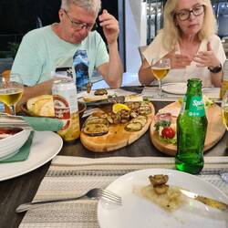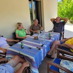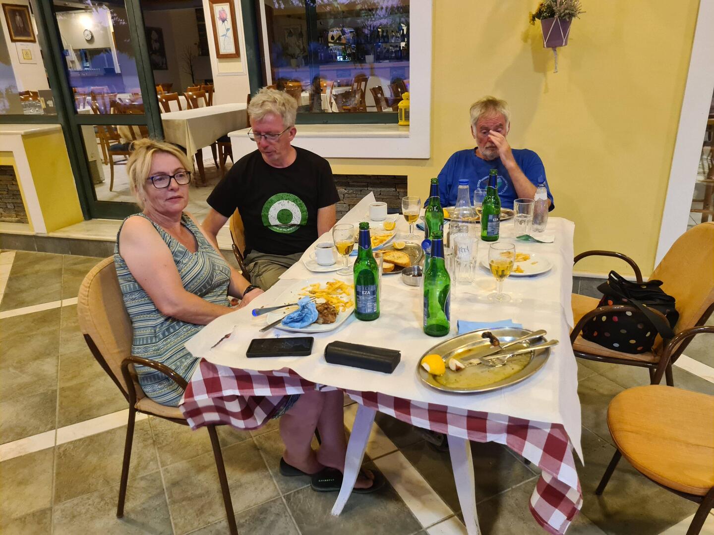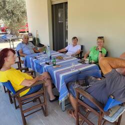 8.9. Ruhetag. Gefrühstückt, gelesen, nachmittags griechischen Salat, gelesen, abends Bratkartoffeln mit Ei gebraten, dazu Bier. Kurzer Friedhofsbesuch. Abends kam Uwe mit Raki zu Besuch.