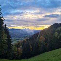 Der Weg der folgte war klasse. Ganz oben auf dem Kamm konnte ich das ganze Tal überblicken. Aber so langsam ging die Sonne unter. Eigentlich wollte ich zum Sonnenuntergang schon oben auf der Salmase Höhe sein. Aber irgendwo hatte ich Zeit verloren. Also gab ich ordentlich Gas. Die letzten Kilometer führen auf einer steilen Straße durch den Wald. Das orangene Licht der untergehenden Sonne wurde von den Tannen quasi geschluckt. Aber ganz knapp schaffte ich es noch und sah zumindest noch ein bisschen den orangenen Himmel vor einem tollen Alpenpanorama.