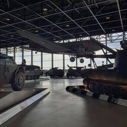 In einer großen Halle werden zu dem unglaublich viele Panzer, Flugzeuge, Jeeps und Kanonen ausgestellt.
