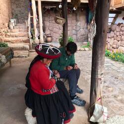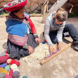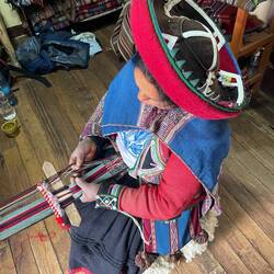Así que nos vamos de “fin de semana” al pueblo de Chinchero donde la tradición del tejido continúa, hay muchos talleres dirigidos por mujeres andinas y un mercado muy animado los domingos también lleno de tejidos. Ese domingo hicimos un taller de iniciación al tejido plano, por la mañana una pulsera pequeña y luego continuamos por la tarde con un cinturón que terminamos con una hora de retraso 😅 no sabemos cómo las mujeres logran tener tanta paciencia tejiendo piezas enormes, entendemos aún mejor la belleza de los tejidos.