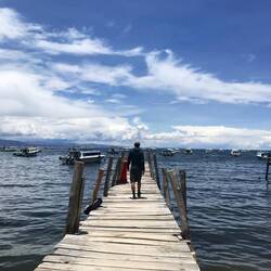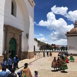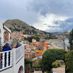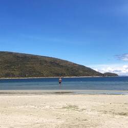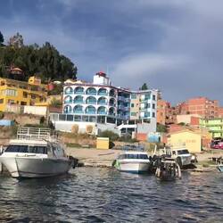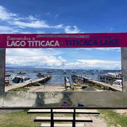 🇪🇸 Después de un viaje en autobús hasta Puno y una buena limpieza de las bicicletas, bordeamos el lago Titicaca durante varios días. Es el lago más alto del mundo, ¡nos lleva casi cinco días cruzarlo! Y en medio del lago cruzamos la frontera de Perú 🇵🇪 hacia Bolivia 🇧🇴. El cuarto país de nuestro viaje. Pasamos dos noches en Copacabana, donde tenemos la impresión de estar en una ciudad costera.