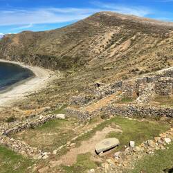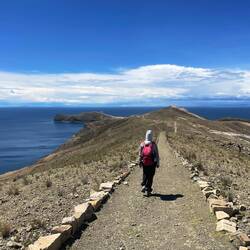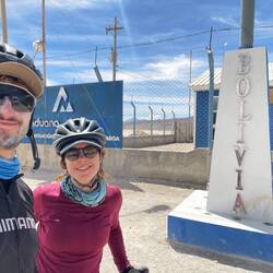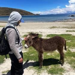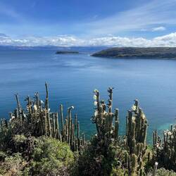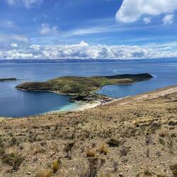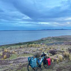🇫🇷 Après un trajet en bus jusqu’à Puno et un bon nettoyage des vélos, on longe le lac Titicaca pendant plusieurs jours. C’est le plus grand lac d’altitude au monde, ça nous prend presque cinq jours pour le passer ! Et au milieu du lac on passe la frontière du Pérou 🇵🇪 vers la Bolivie 🇧🇴 ! Quatrième pays de notre périple. On passe deux nuits à Copacabana, où on a l’impression d’être dans une ville de bord de mer.