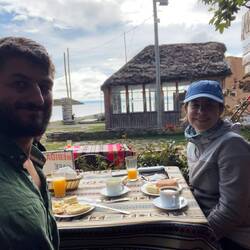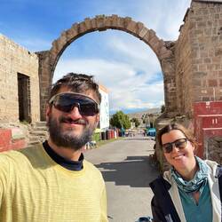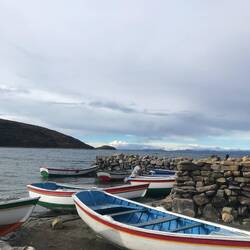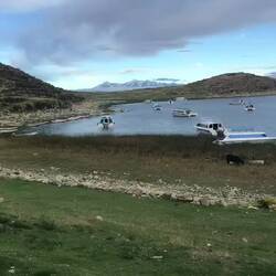 🇫🇷 Nous quittons le lac Titicaca, mais nous devons d'abord le traverser, et nous tombons sur un embouteillage de bateaux ! La traversée, qui dure normalement 15 minutes, nous prendra près d'une heure, alors nous finissons par dormir dans un hôtel voisin car la nuit tombe. Le lendemain, nous cherchons un endroit où monter la tente, nous trouvons un terrain de football dans un village et demandons si nous pouvons la monter là. En réponse, ils nous invitent à dormir dans la maison de leur oncle, qui n'est plus utilisée. Cela nous arrange bien, car il pleut toute la nuit ! Au loin, les montagnes rocheuses sont désormais blanches. Le lendemain, le couple nous apporte même quelque chose à boire et à manger. Un accueil magnifique pour nos premiers jours en Bolivie !