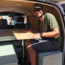 Quelques planches en bois et des matelas aménageables nous permettent de faire un lit ou un canapé quand la météo ne nous permet pas d’être posés dehors.
