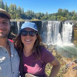 🇫🇷 On s’arrête sur la route pour aller voir la jonction entre deux grands fleuves, on est impressionnés par la force de l’eau et toutes les nuances de bleu ! De ce qu’on lit, ce fleuve est l'un de ceux avec le plus de débit en Patagonie.