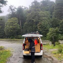 Llegamos al centro de Tompkins Park, el creador de las marcas North Face y Esprit, que compró enormes superficies en la Patagonia hace décadas para protegerlas. Hoy estas reservas naturales son gestionadas por el Estado chileno. Hay caminos y caminatas durante todo el trayecto, y campings con duchas y baños. Todo está previsto para viajeros como nosotros que viajan por la Carretera Austral en furgoneta, autobús o autostop.