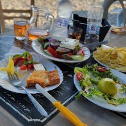 Wieder eine tolle Taverne gefunden , wie in den 80gern auf Plastikstühlen und Plastik Sonnenschutz 😆 super lecker Essen und ein Kilo Wein 🍷 Γαμασ