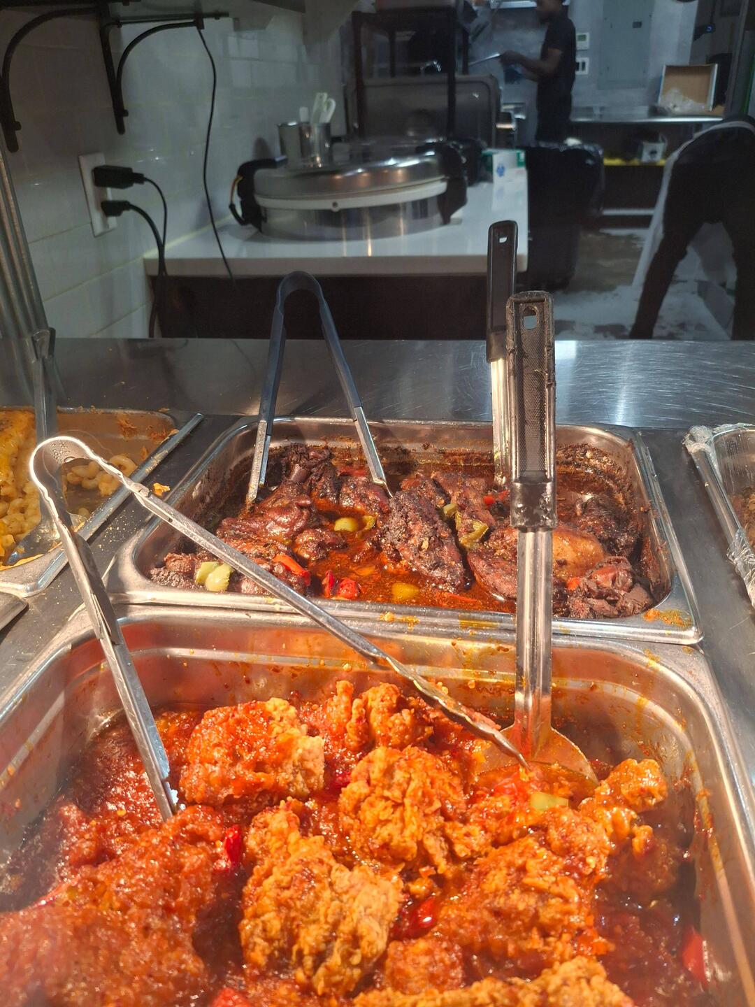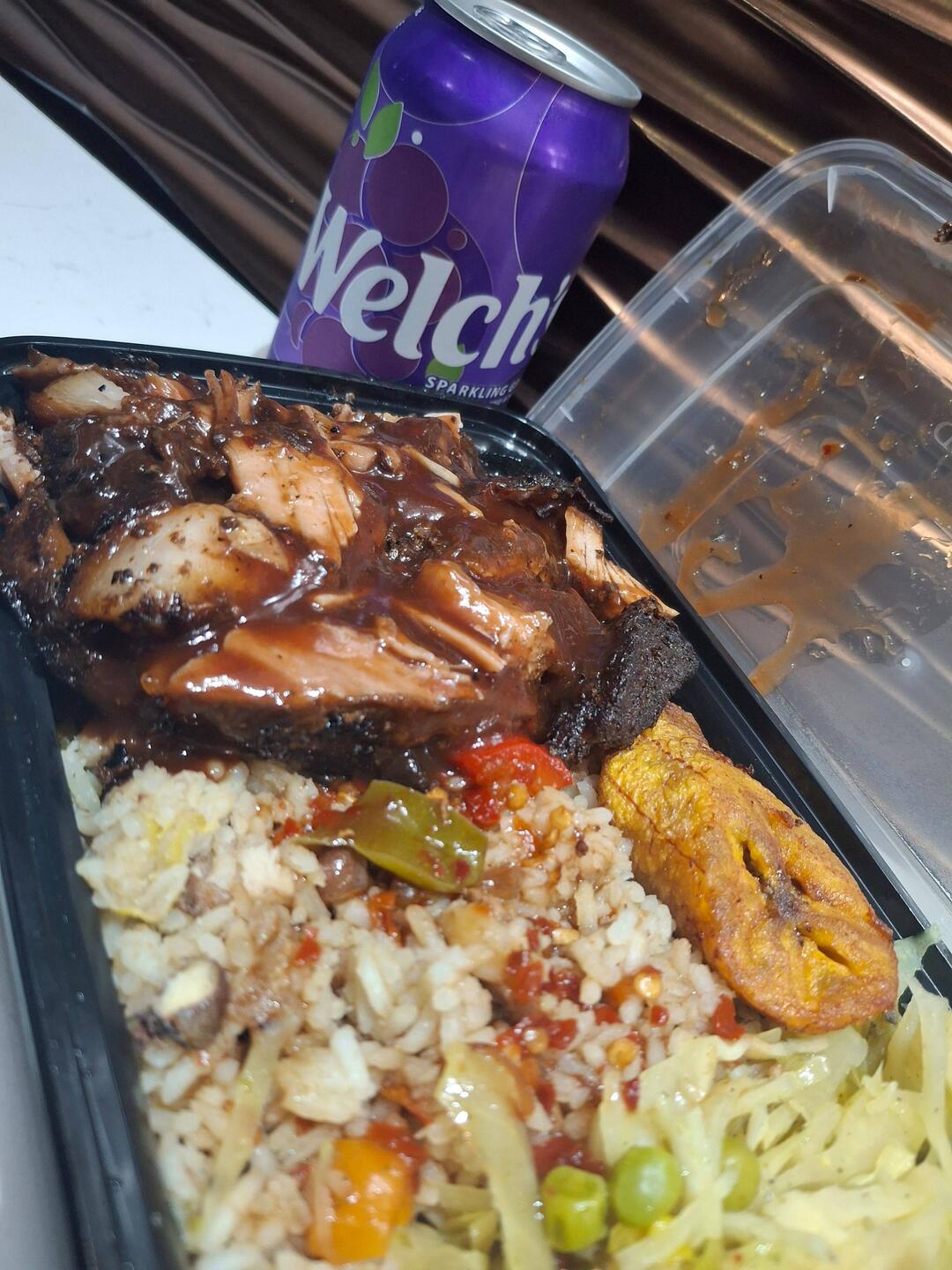 That falls apart and almost melts in your mouth. I ordered with rice and peas, which was drizzled with jerk sauce.. Delicious. I had medium size also served with cabbage and plantains.. but I only gotLeia mais