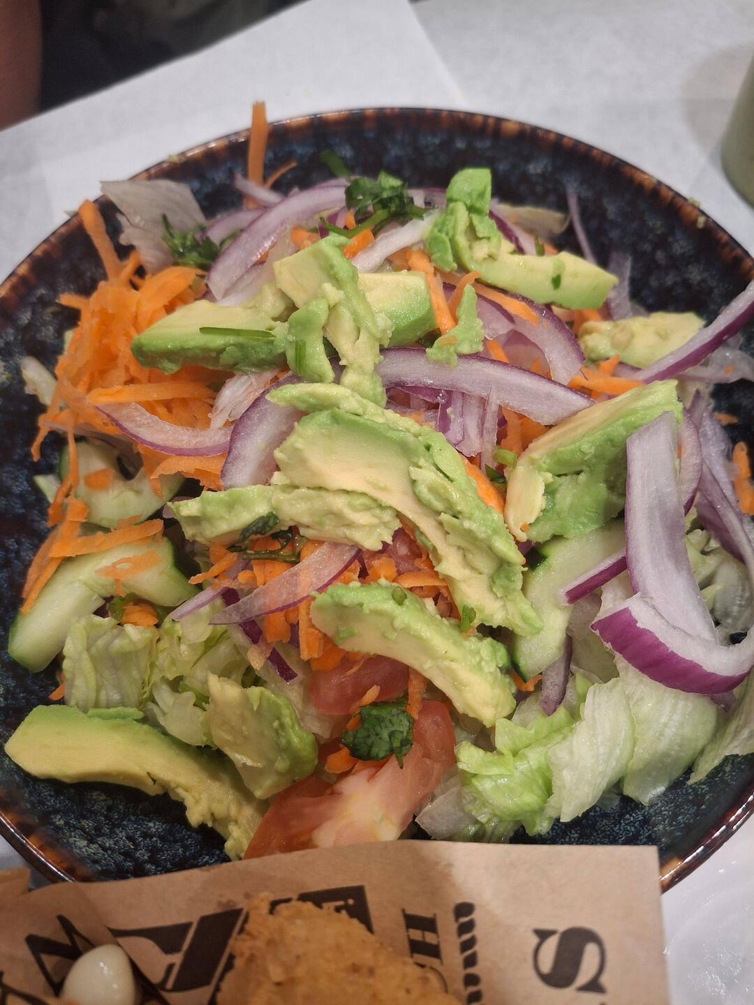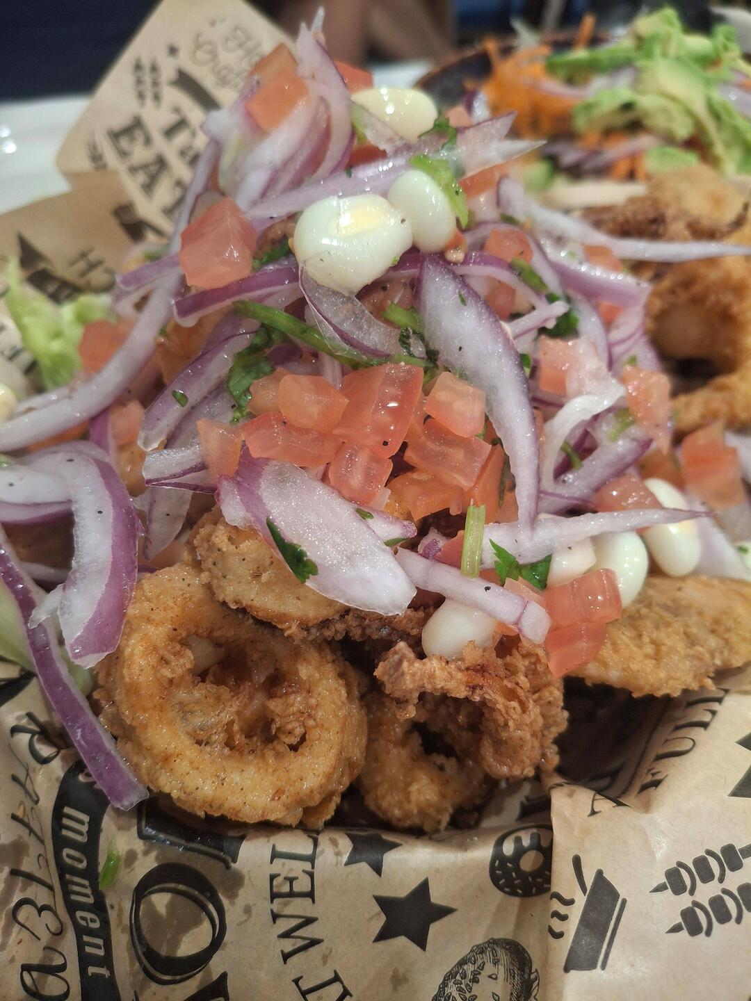 A delicious seafood combination that had probably the best calamari rings I have ever had. Lightly battered, flavorful and tender. Also in the mix, octopus, mussels, shrimp, fish.. and yucca.Læs mere