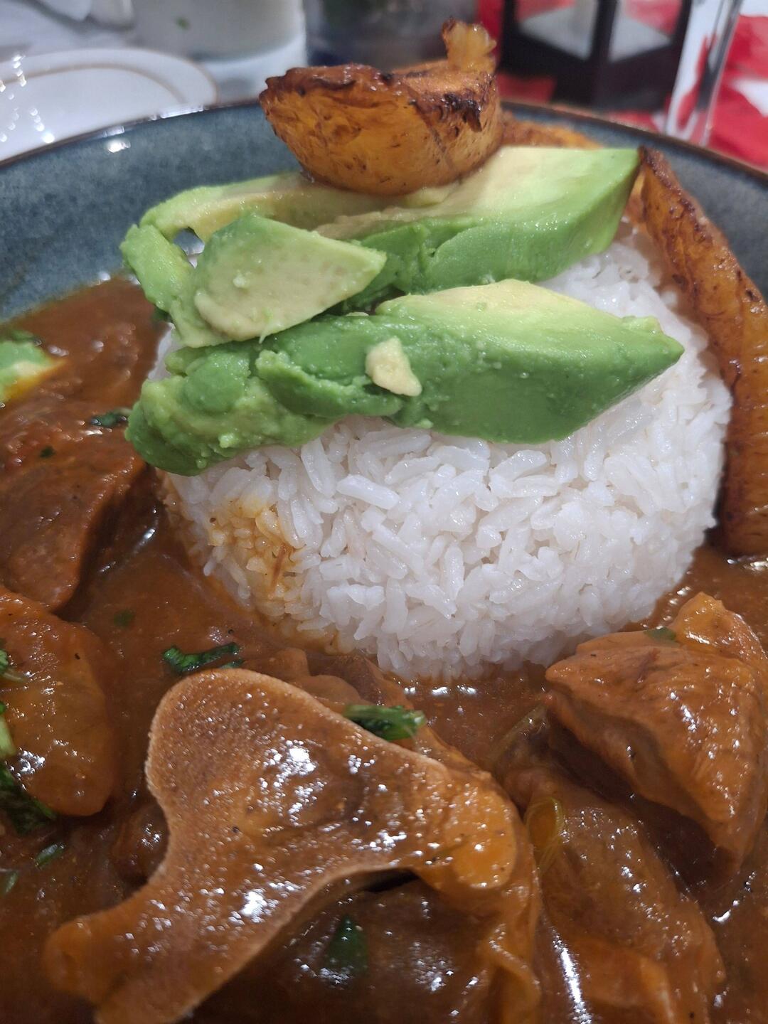 Slow cooked "Ecuadorian" goat stew served with rice, plantains and avocado