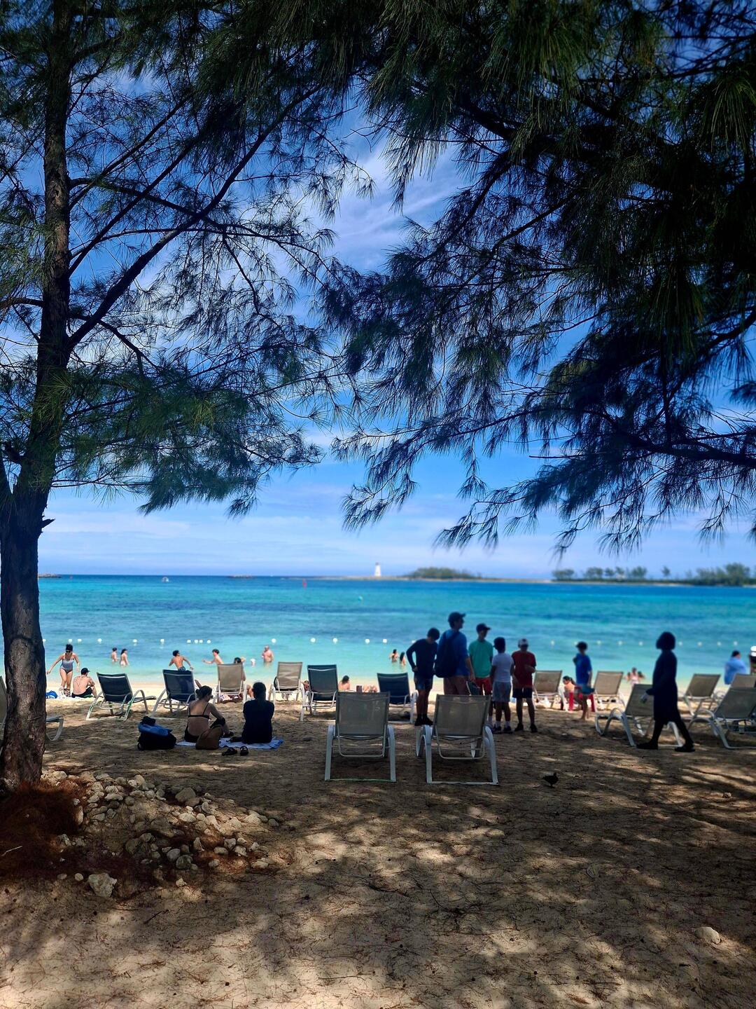 Nice public beach about 30 min walk from cruise terminal. $20 for beach chairs and umbrellas. Local food with fair prices.. but you're free to BYOB.. and find shade away from "tourist spot"