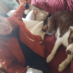 Wie bereits beschrieben, saßen wir abends, nachdem wir im Café Nudeln mit Pesto von Margaret gegessen hatten, zusammen mit eben dieser und Heeeeleeeena und unterhielten uns über Gott und die Welt - und das gleich zweisprachig. Da wurde auf Deutsch geplaudert und dann auf Englisch weitergesprochen, was teilweise echt lustig und verwirrend war. Derweil wurde dauerhaft die Katze (nennen wir sie mal Felix 2.0) und Daisy gekrault. Irgendwann, zwischen meinen Fluchtversuchen wegen diesen blöden Riesensschnarkenviechern, Heeeleenas (der anderen) Versuchen mich von denen zu befreien und der Flüchtlingskriese, tapste Daisy zu Margaret, die gerade ihr Buch auf so einem mega coolen Hochfahrsessel las, und begann ihr die Füße zu lecken.