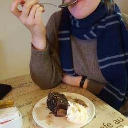 Nach einigen erfolglosen Telefongesprächen Margarets liefen wir dann in die Küche, um uns Sandwiches zu machen und vom lustigen portugiesischen Suppenmann Suppe zu bekommen und dann ging es (endlich! Halleluja!) ins Café und ich bekam meinen Schokokuchen mit dem ich schon 10 Tage geliebäugelt hatte (also nicht mit demselben Stück versteht sich)- er war lecker!