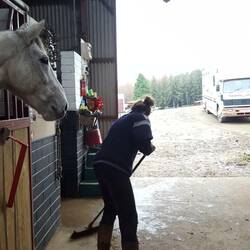 Sonntag, unser letzter Arbeitstag, bevor es weiter nach Dublin ging. Und auch dieser sollte es (typisch Wochenende) in sich haben. Marine, Tons und ich misteten, fütterten, zogen Decken von Pferderücken, striegelten und sattelten Pferde, sodass um 9.30 Uhr der erste Trek beginnen konnte. 6 Pferde von 7 waren damit aus den Ställen und Marine! Denn diese ritt auf Hannah mit in den Wald.
