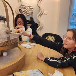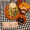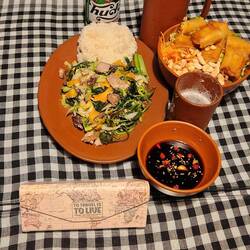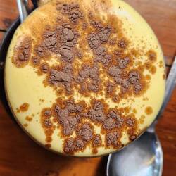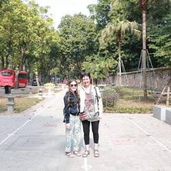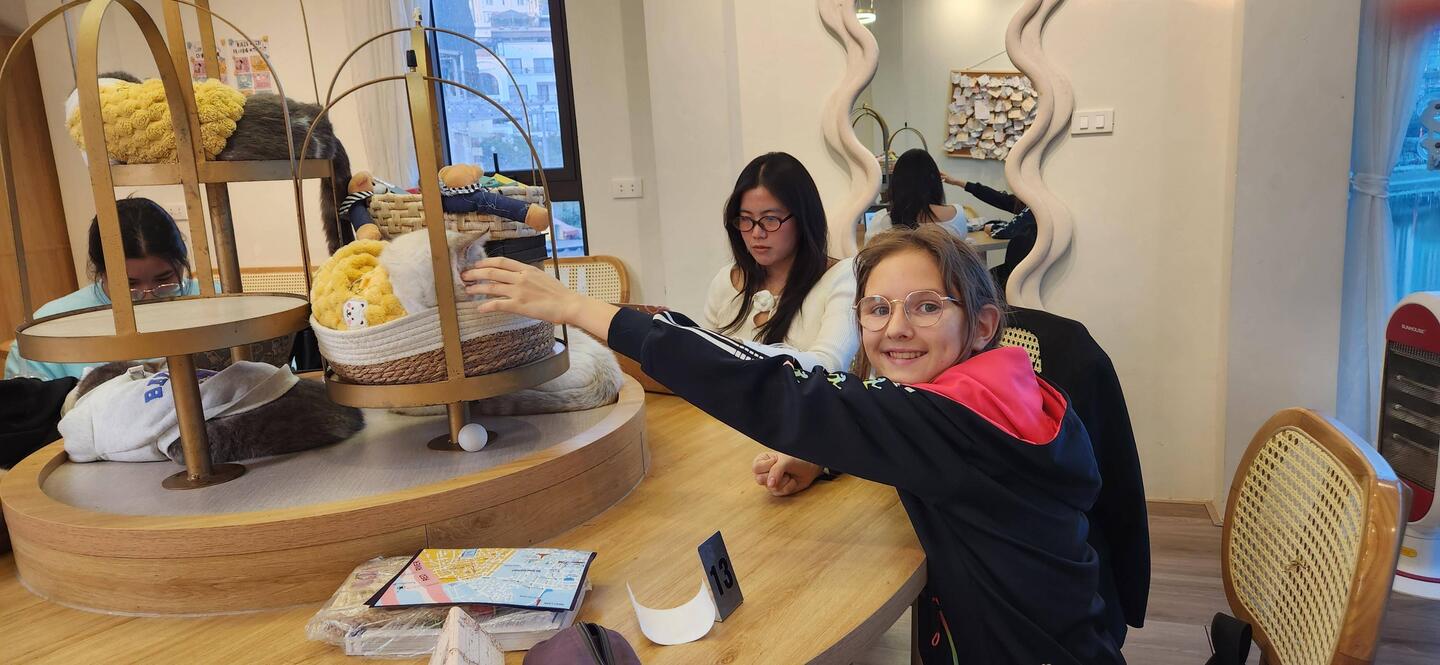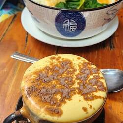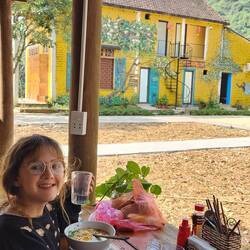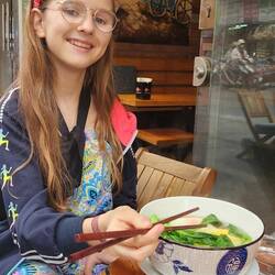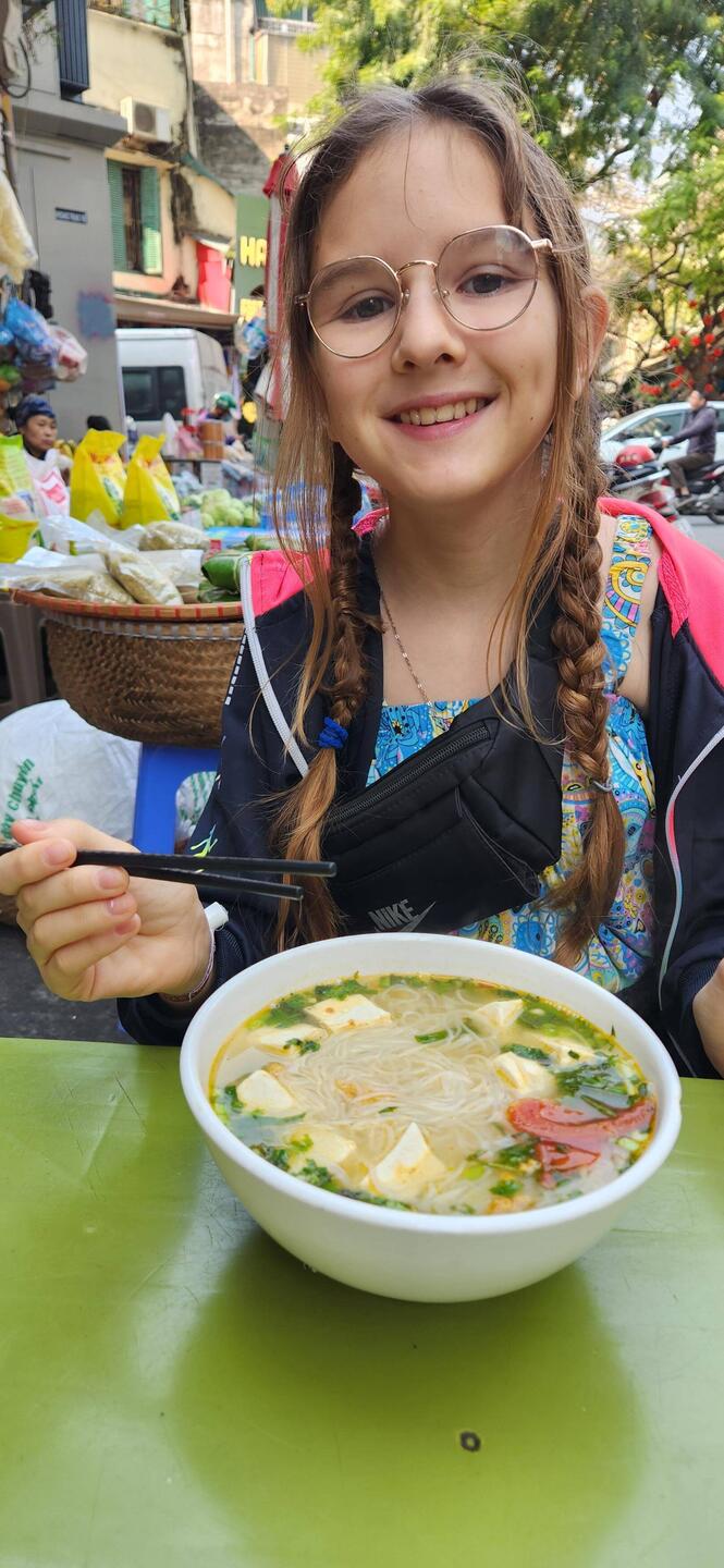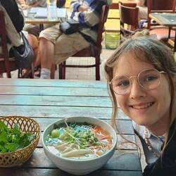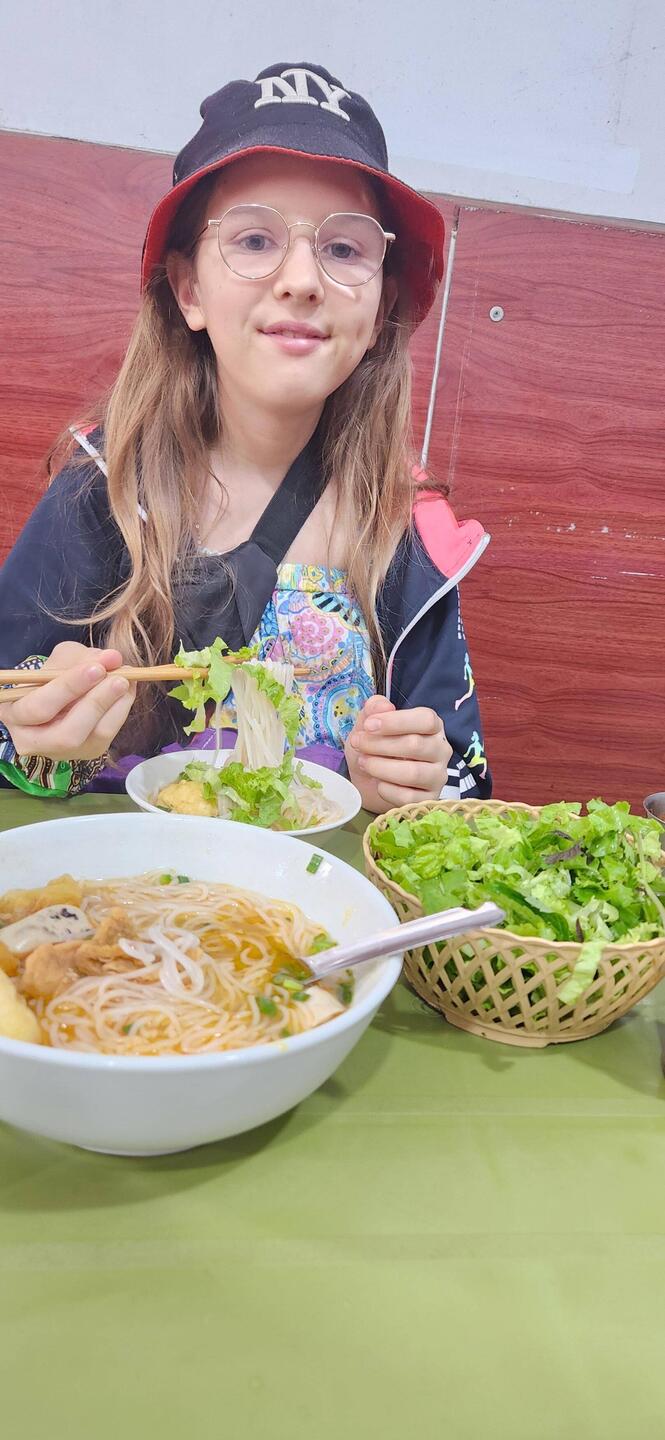 Après 24h de voyage sans dormir, nous voici attablées ! Louna teste les Noodles et moi le café vietnamien à l'oeuf, c'est déroutant et délicieux.