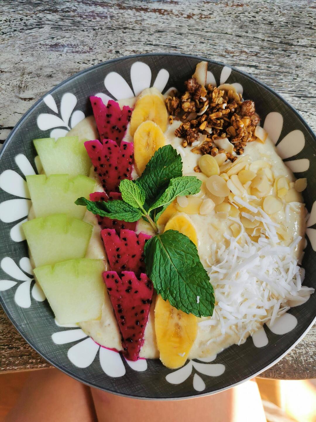 Heute haben wir den Tag am Pool verbracht und ich habe gelesen. Zum Mittag hab ich mir eine super leckere Bowl gegönnt 😍 aus Mango, Banane und Kokosnuss mit Joghurt und das Topping. Omg die war so lecker 😋