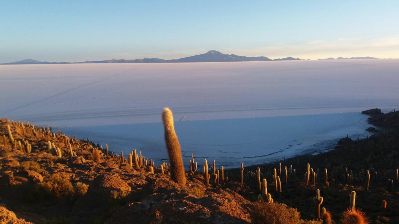 Das war nun das Sahnehäubchen. Miguel ist nun bei uns allen durch. Mit nicht grad der besten Laune fahren wir im dunkeln auf die Salzwüste. Ein magischer Augdnblick und CD Spieler läuft das ganz alte Lied silence. Passt irgendwie und hebt die Stimmung. Die Salar de Uyuni ist rießen Groß über 15.000 Quadrstkilometer. Nach einer halben Stunde Fahr auf dem Salz kommen wir im mitten der Salar an eine Insel vorbei. Es erscheint als wäre dies eine Insel aber nein das ist es nicht. Vor vielen Jahren als das hier noch ein See mit Wasser war, war diese "Insel" ein kleiner Hügel in der Unterwasserlandschaft. Man erkennt auch noch die Krater und Spuren von damaligen Wasserpflanzen. Heutzutage wachsen hier Kakteen das komplette Gegenteil. Schon umfassbar wie viel Wasser hier in der Gegend verdunztet ist.